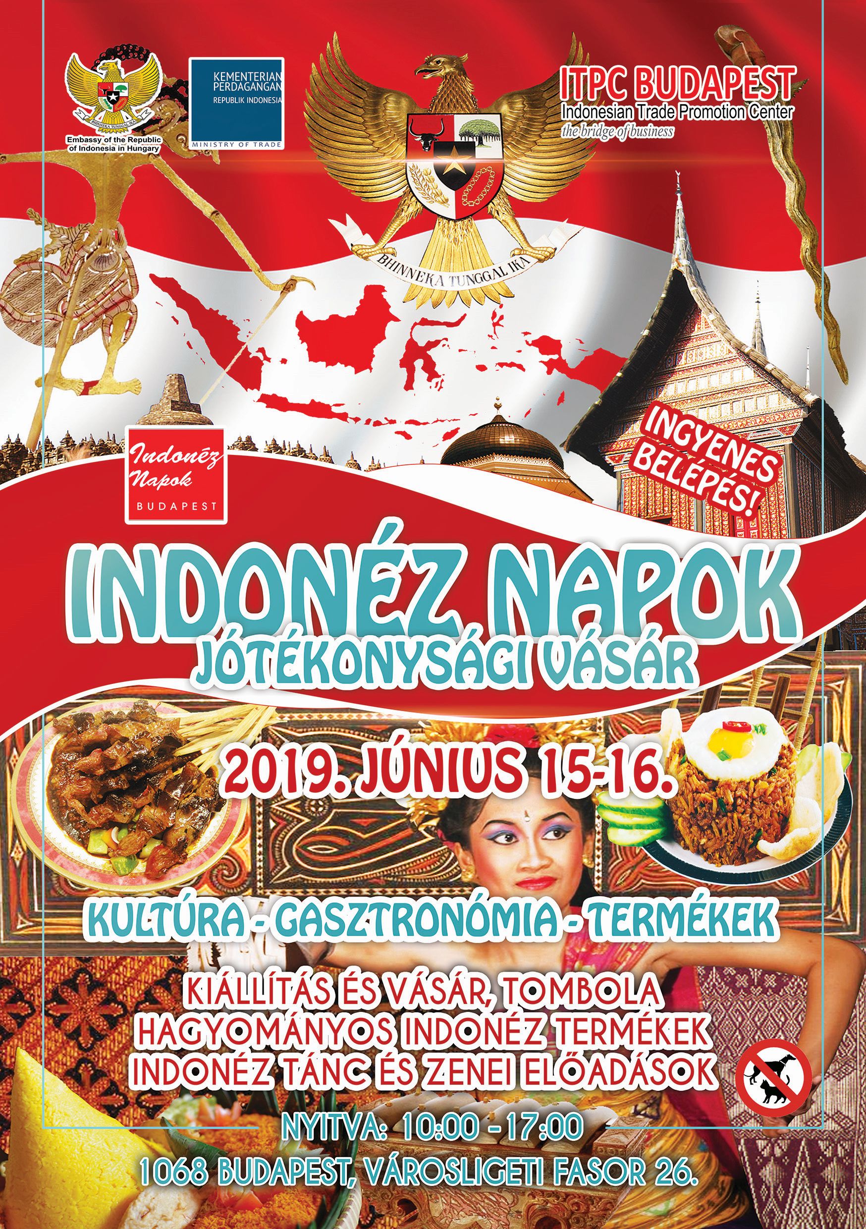 Az Indonéz Nagykövetség az ITPC Budapest-el együttműködve megszervezte az Indonéz Napok Jótékonysági Vásárt június 15 és 15 között. A helyszín a Nagykövetség területe volt, amely gyönyörű környezet a legnagyobb magyarországi indonéz eseménynek. Miközben a látogatók megtekinthették a folyamatos zenei és táncelőadásokat a színpadon, lehetőség volt megkóstolni az indonéz gasztronómia remek ételeit és italait. Sok indonéz kiállító és magyar importőr mutatta be a termékeit, szóval a látogatók nemcsak a szívükben vihettek haza egy darabot Indonéziából, hanem ajándék formájában is. Köszönjük a látogatást!